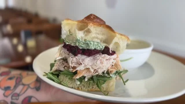 House smoked red beet relish, spinach dip schmear, house turkey, garlic aioli and arugula ๐ฅ๐คค